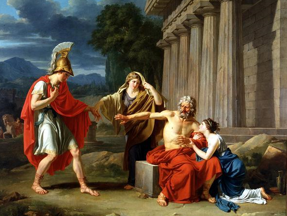 فولكران-چان هارييت، أوديب في كولونوس (1798)، زيت على قماش، 157x134سم، متحف كليفلاند للفنون. تصور اللوحة أوديب الأعمى وابنته أنتيجونا.